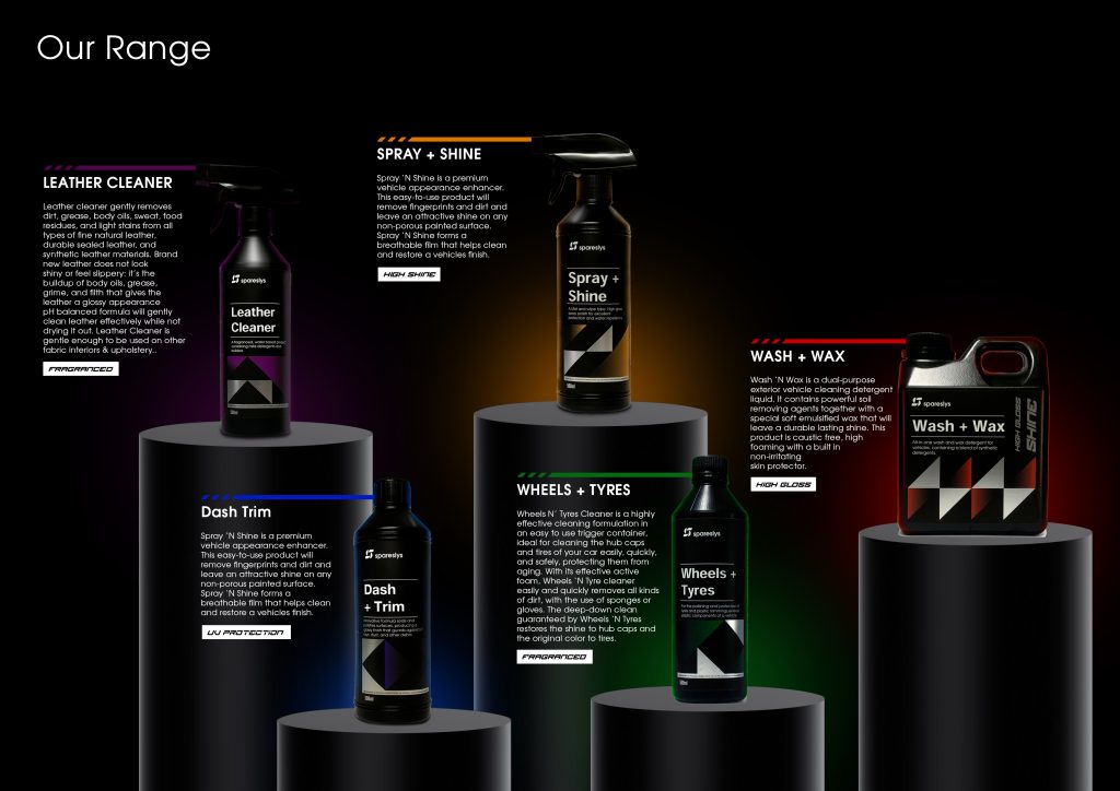 iGugu Solutions was commissioned to design the packaging for Spareslys Car Care products. The project focused on creating visually striking and functional packaging that aligns with the brand’s identity and communicates quality and reliability to consumers. From label design to product packaging layout, iGugu Solutions developed a cohesive visual system that enhances shelf appeal and reinforces the professional image of the Spareslys brand. The final designs balanced bold aesthetics with practical considerations, ensuring the packaging was both attractive and user-friendly. This work played a key role in elevating the brand’s presence in the competitive car care market.